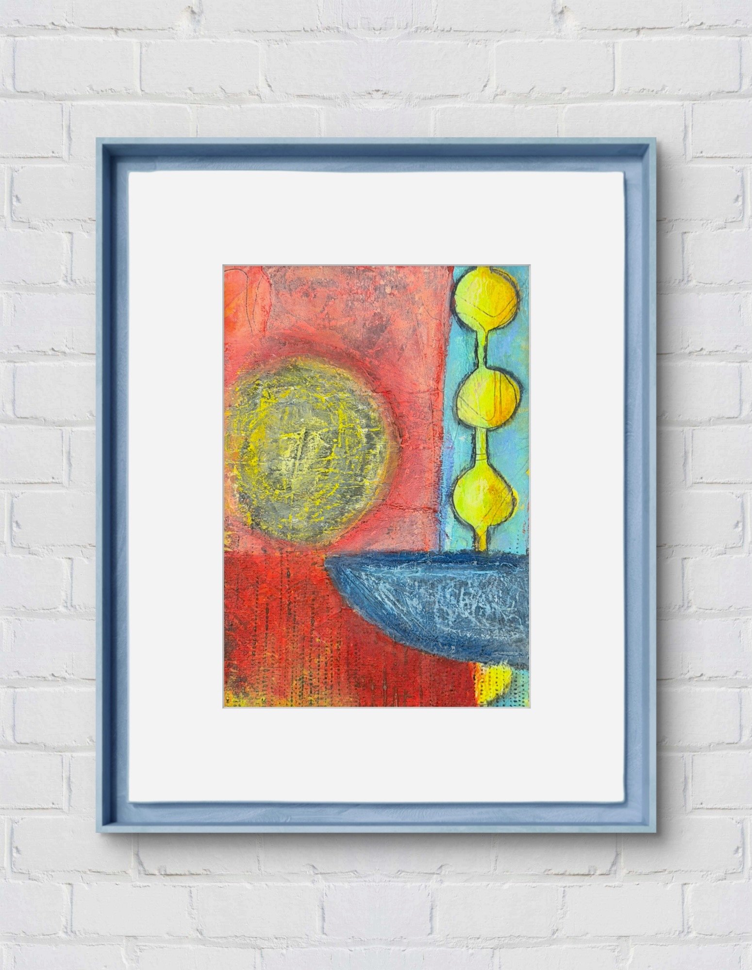 Mixed media original painting/collage. White mat board with painting size approx. 5"x7". Ready for 8"x10" frame. Frame not included.